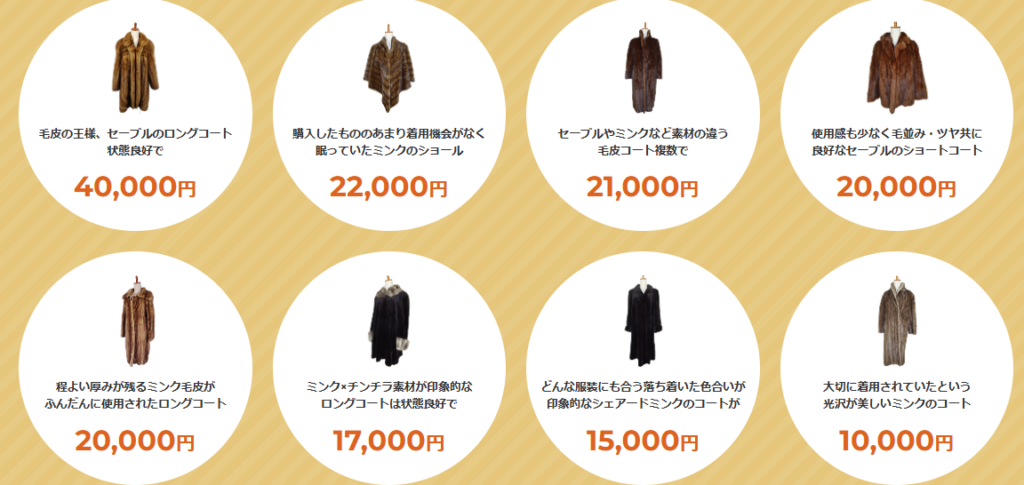 1点1点査定していただいた時の言葉使いも丁寧でしたし、他で見てもらえなかった毛皮についても嫌な顔しないで1点1点細かく見てもらえて誠実な対応だなと思いました。 金額も大満足ですよ!(公式サイトのお客様の声より)